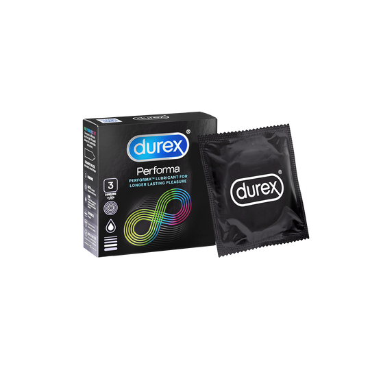 Bao cao su Durex Performa chứa chất bôi trơn Performa™ có tác dụng làm chậm con đường lên đỉnh, giúp chàng càng thêm hưng phấn và kéo dài cuộc yêu. Được cải tiến về thiết kế và mùi hương để bạn xung trận chẳng cần lo toan.