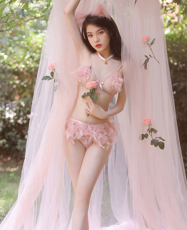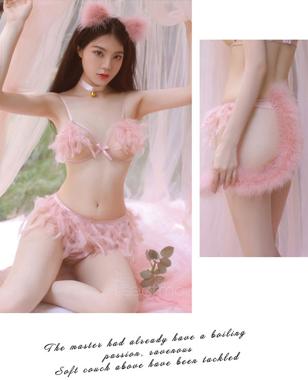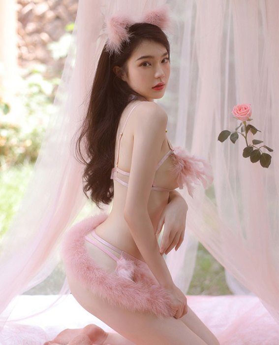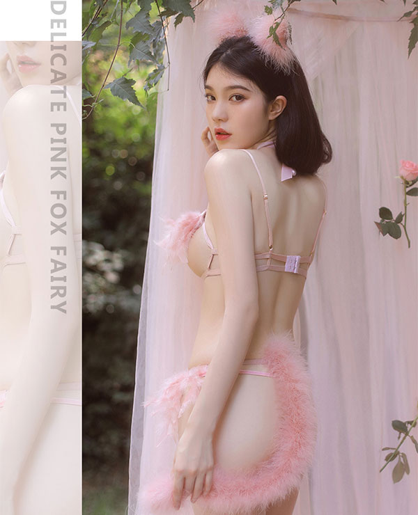 Set gồm tai hồ ly, vòng cổ đính chuông, áo ngực hở ngực, chân váy đính đuôi hồ ly, quần lót